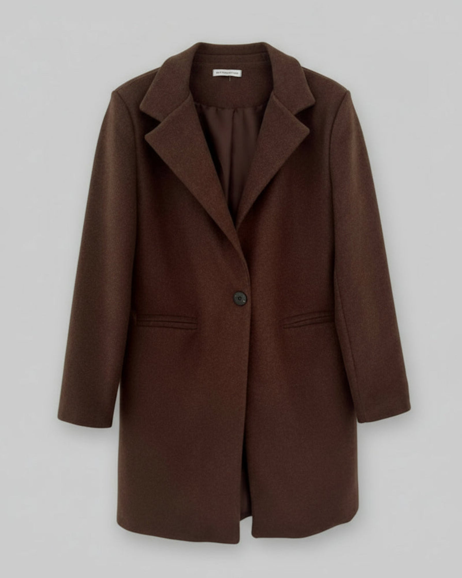 Abrigo de cuello solapa y manga larga acabada. Bolsillos laterales. Forro interior a tono. Cierre frontal con botón.