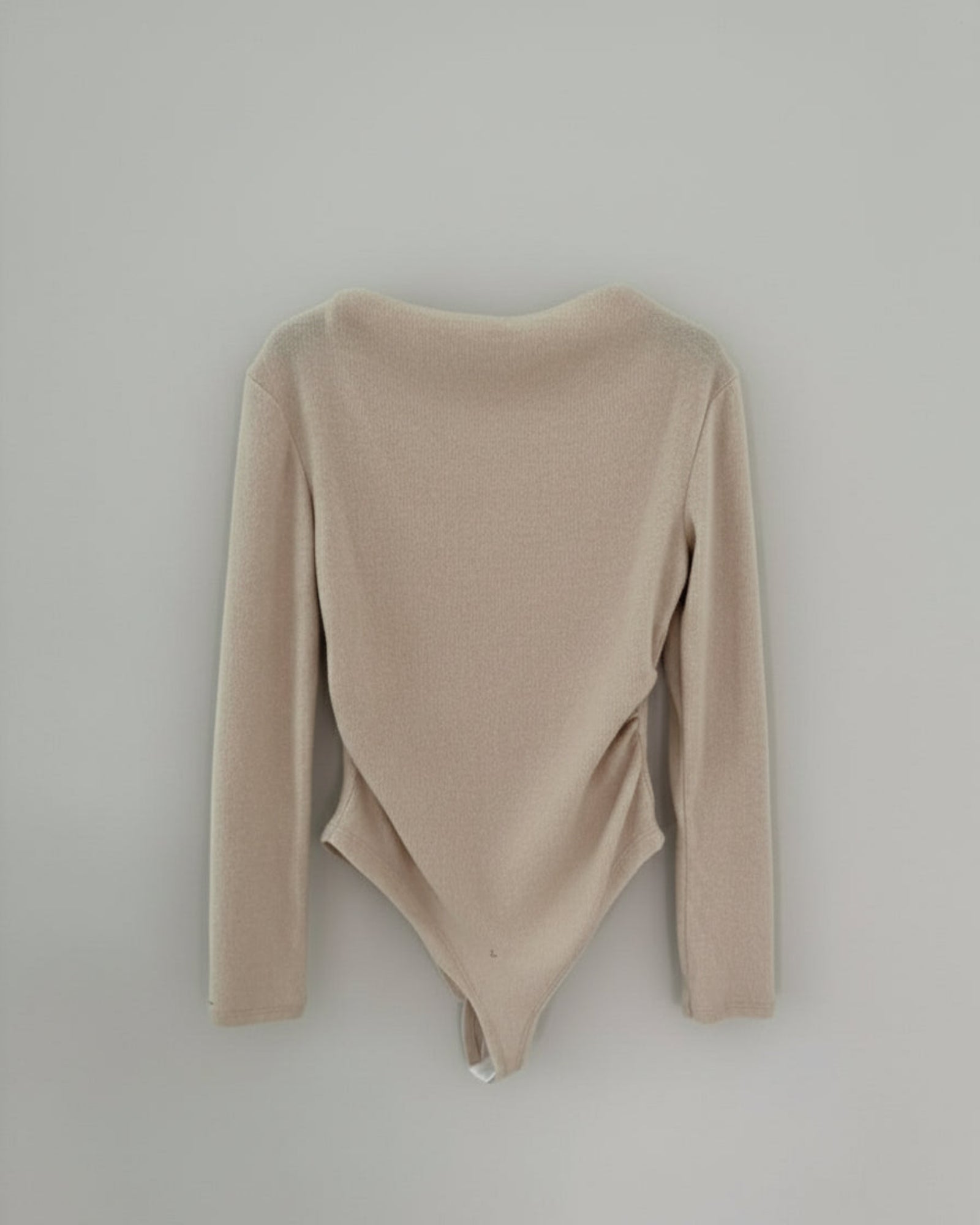 Body con cuello barco y manga larga con detalle de drapeado. Cierre en bajo con botones a presión.