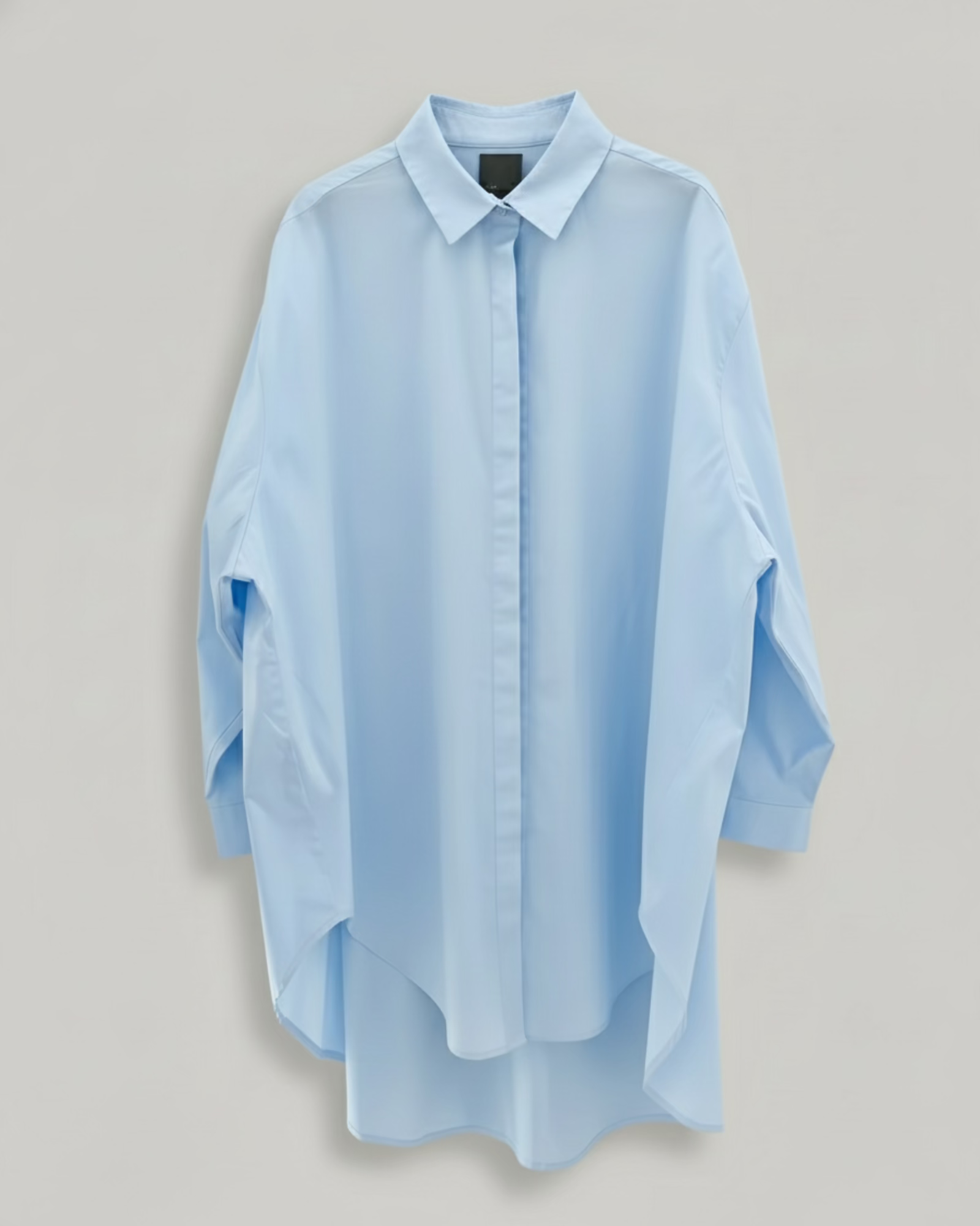 Camisa amplia de cuello solapa y manga larga acabada en puño. Bajo asimétrico, cierre frontal con botones.