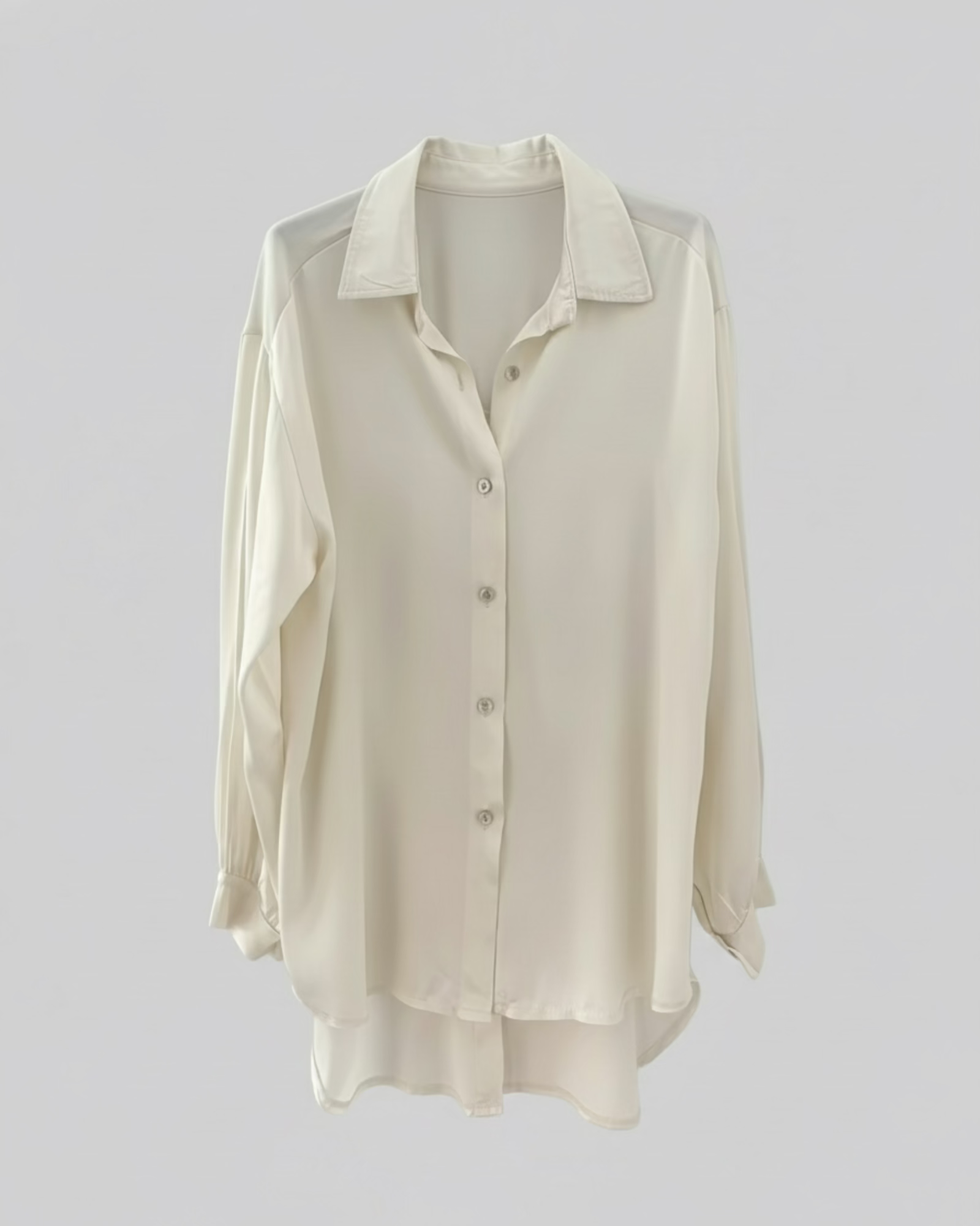 Camisa de cuello solapa con escote pico y manga larga. Manga terminada en puño. Bajo asimétrico. Detalla de cierre con botones en la parte trasera.