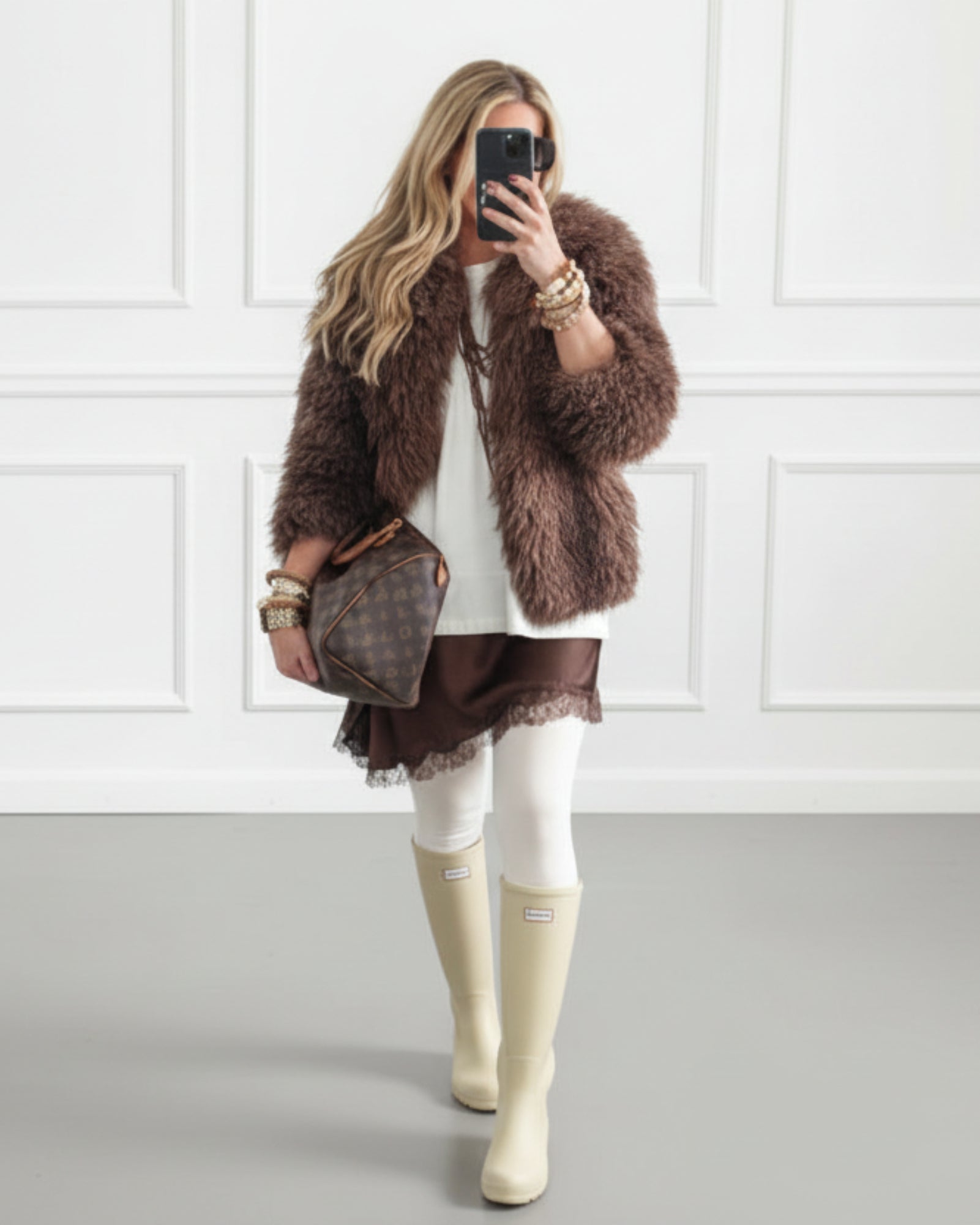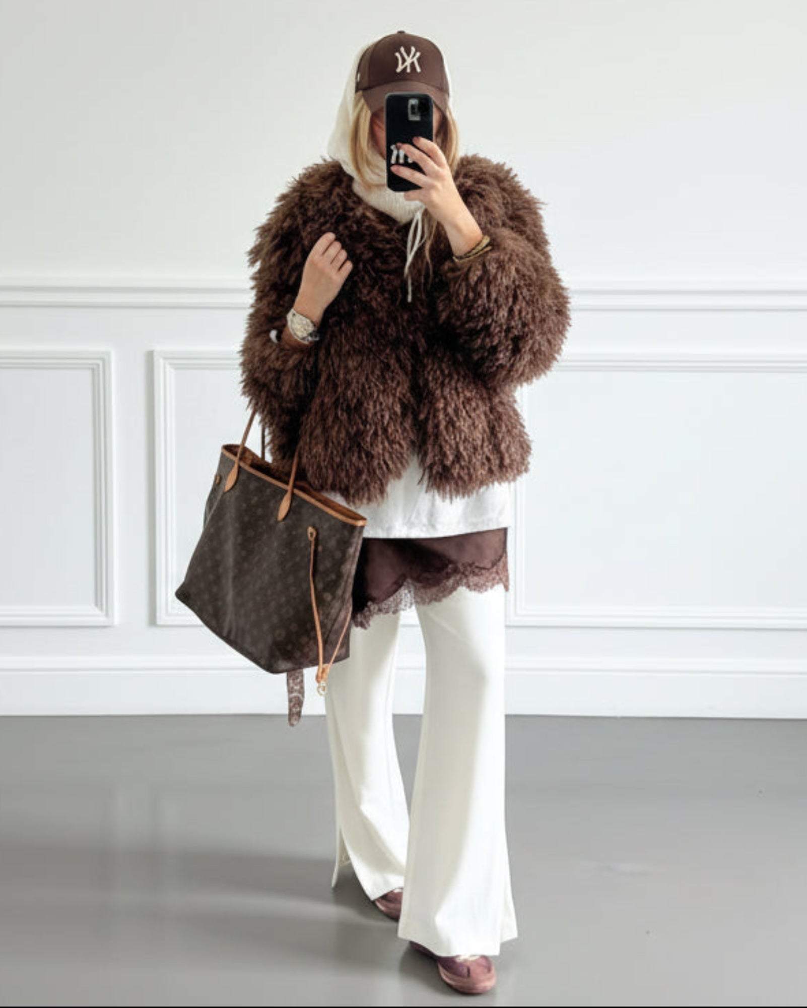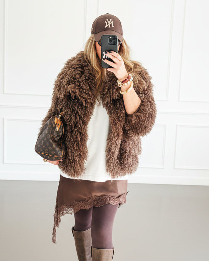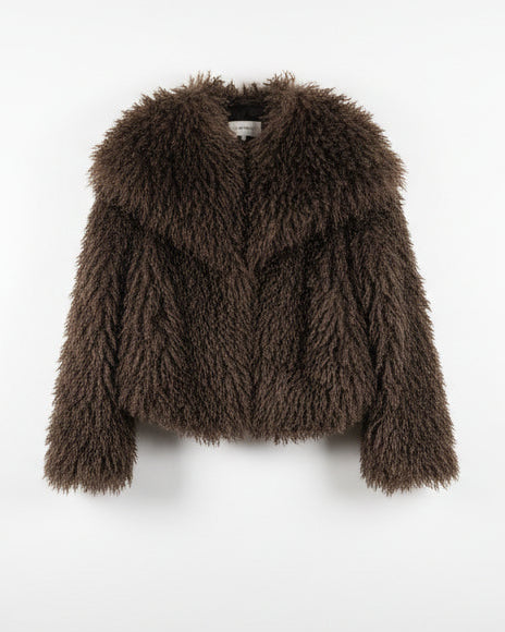 Abrigo corto de cuello solpa y manga larga. Bolsillos en delantero. Detalle de aplicación efecto pelo. Forro interior en tejido efecto piel a tono. Cierre frontal con gancho metalico.