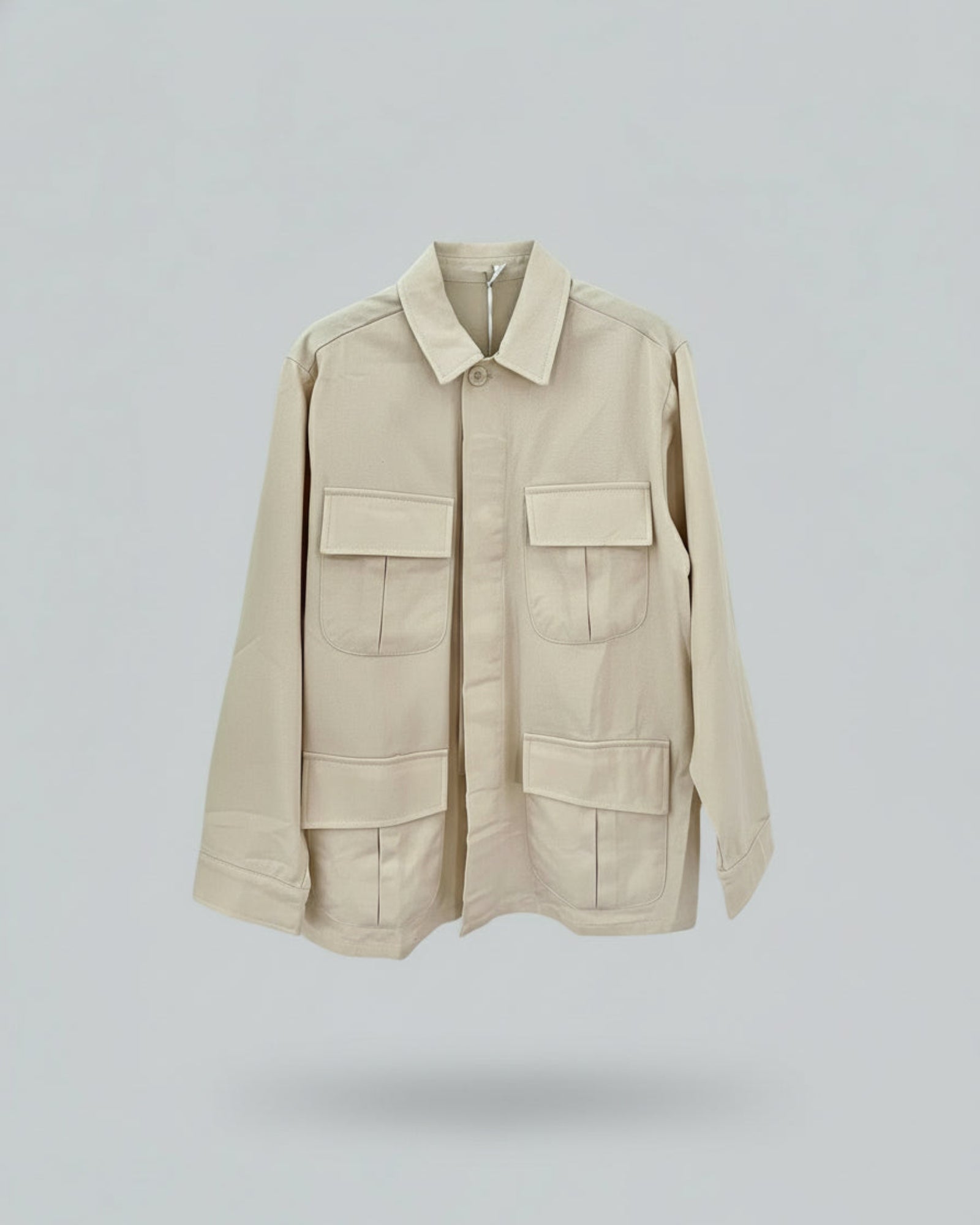Cazadora con cuello solapa y manga larga. Bolsillos delanteros de plastrón con solapa. Cierre frontal con botones ocultos.