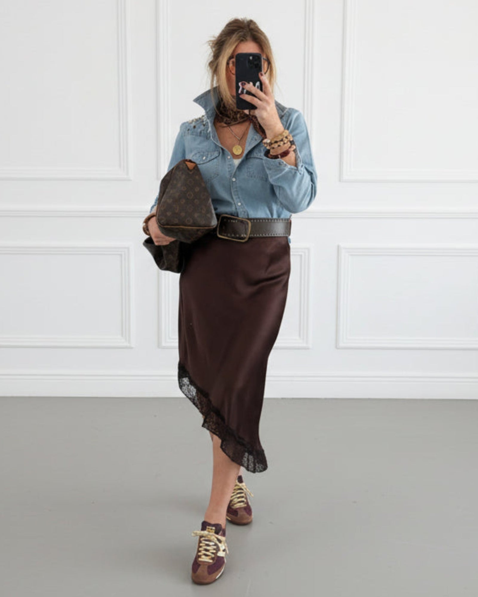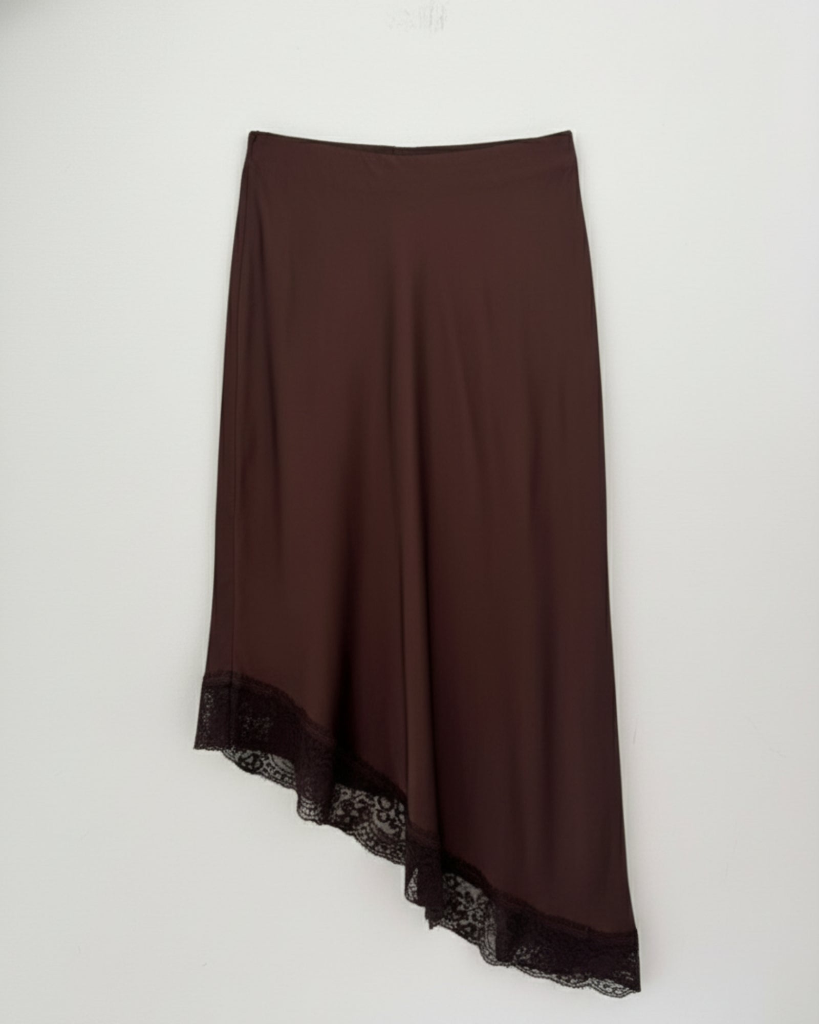 FALDA SATINADA ASIMETRICA ENCAJE MARRÓN