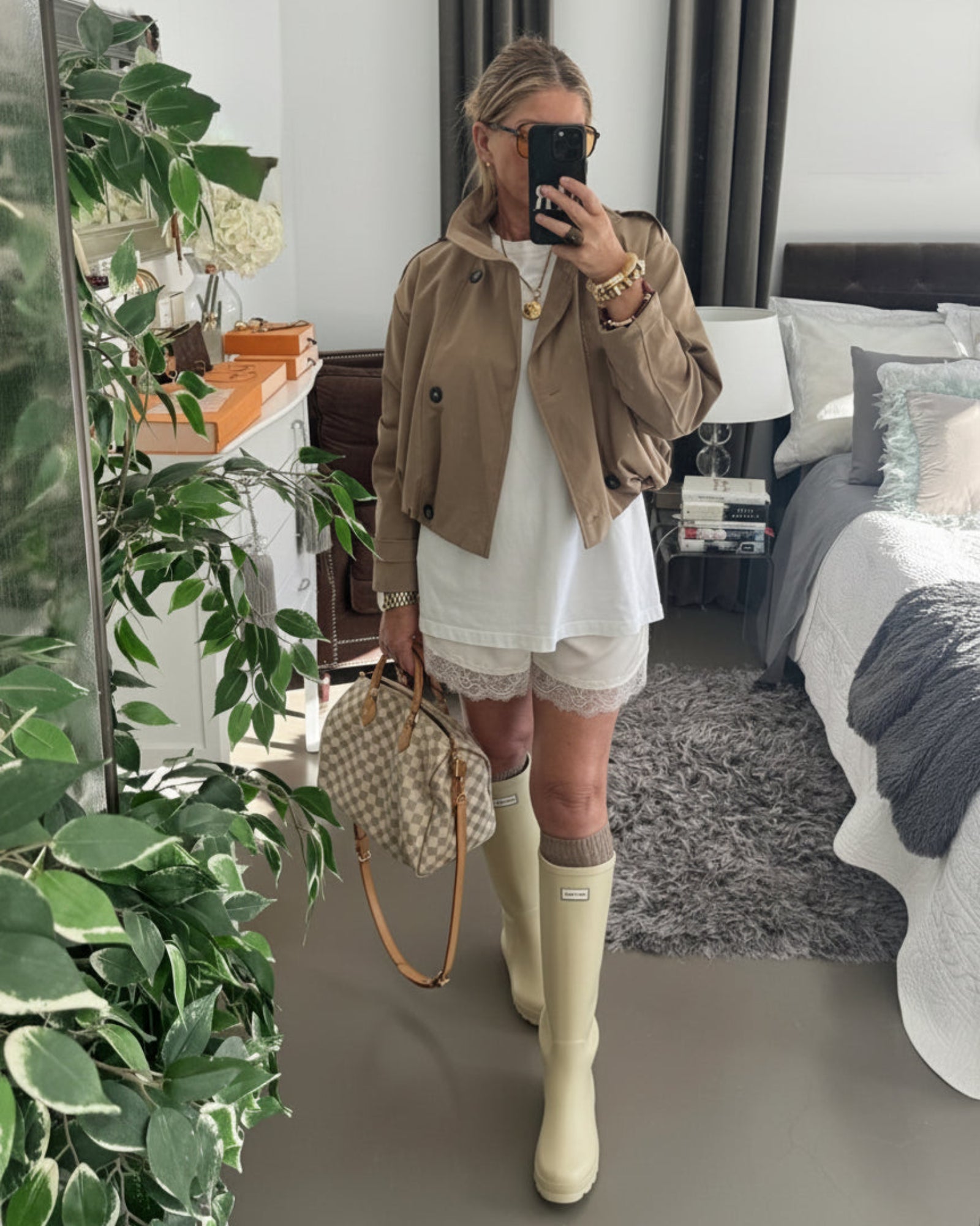 Trench corto de cuello ajustable con botones. Manga larga ajustable con trabillas y botones. Bolsillos delanteros. Bajo acabado en elástico. Detalle de trabillas en hombros. Bolsillos ocultos en laterales. Forro interior. Cierre frontal cruzado con botones.